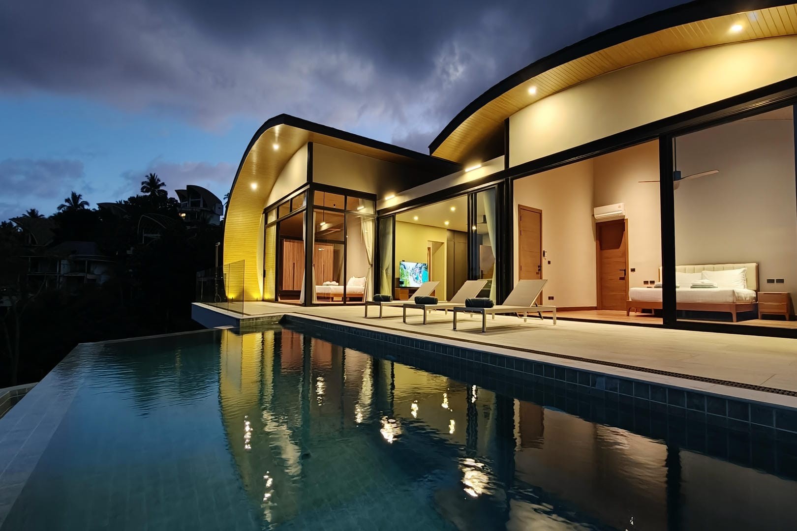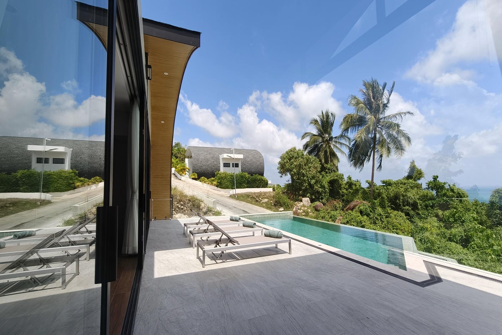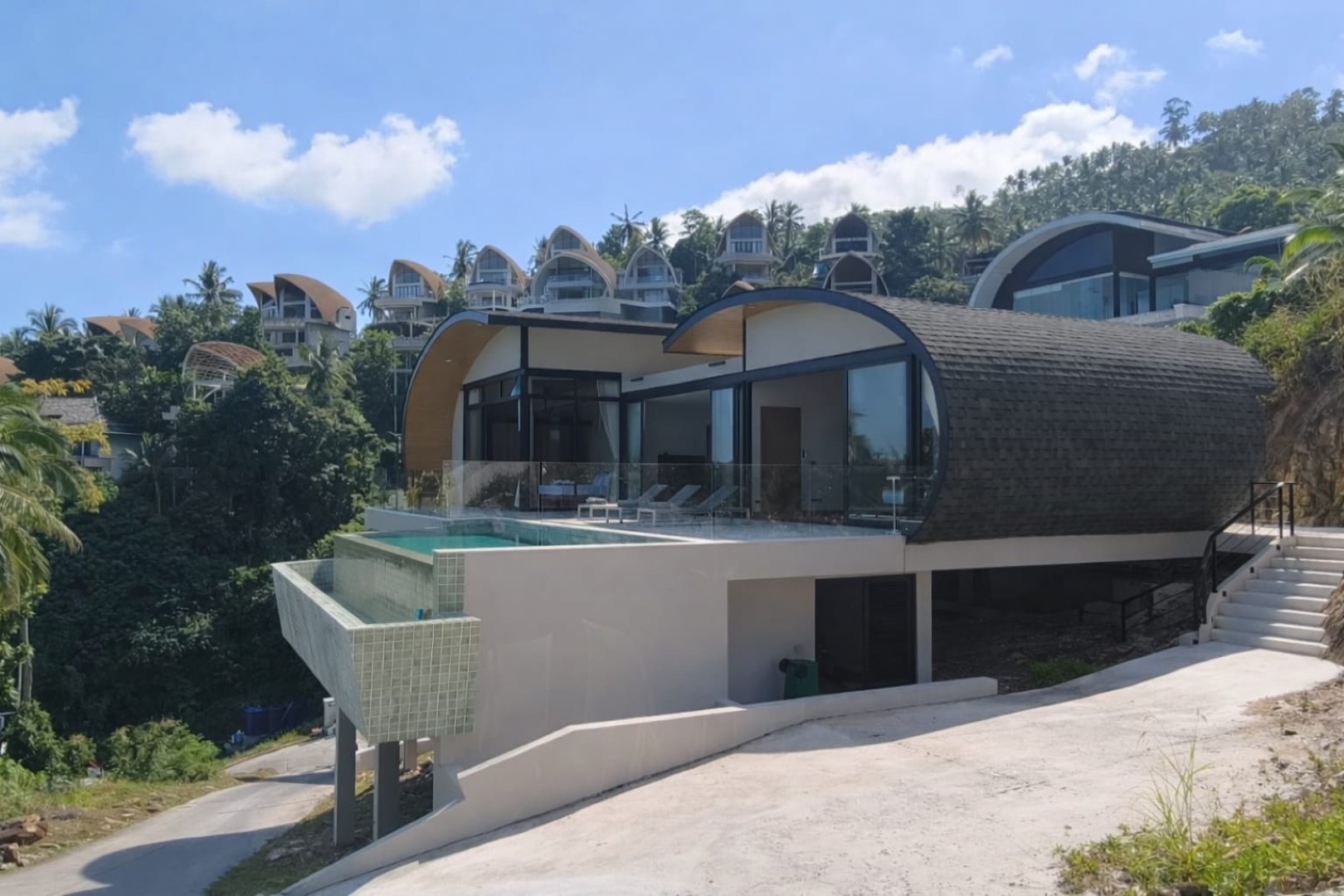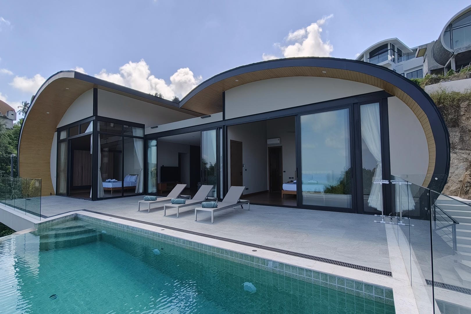 Villa Tenament is a newly built three-bedroom modern villa set on the peaceful hillside of Chaweng Noi, Koh Samui. Showcasing a distinctive curved roof inspired by natural forms, the villa blends contemporary architecture with its tropical surroundings. From the moment you arrive, sweeping ocean views create an immediate sense of calm and exclusivity.