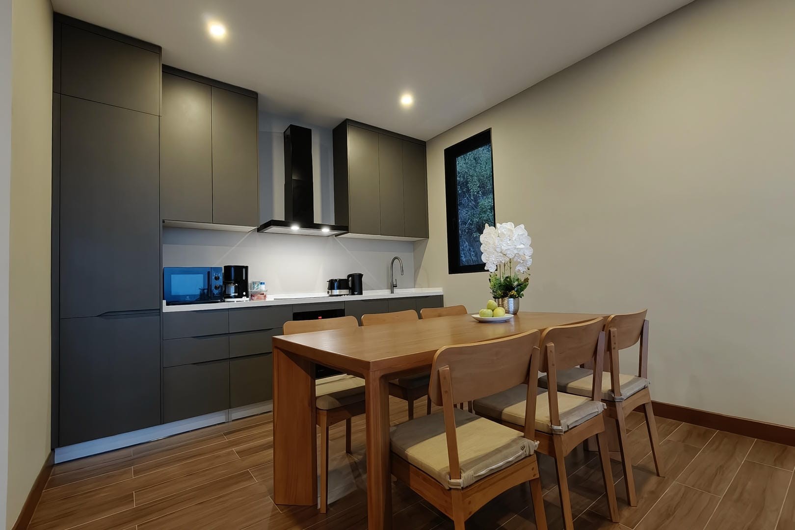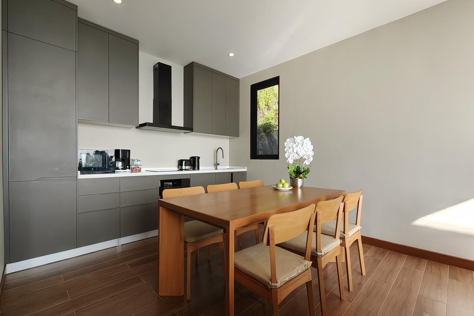 The fully equipped modern kitchen and adjoining dining area provide everything needed for relaxed meals at home, whether enjoying breakfast with ocean views or gathering for dinner with family and friends.
