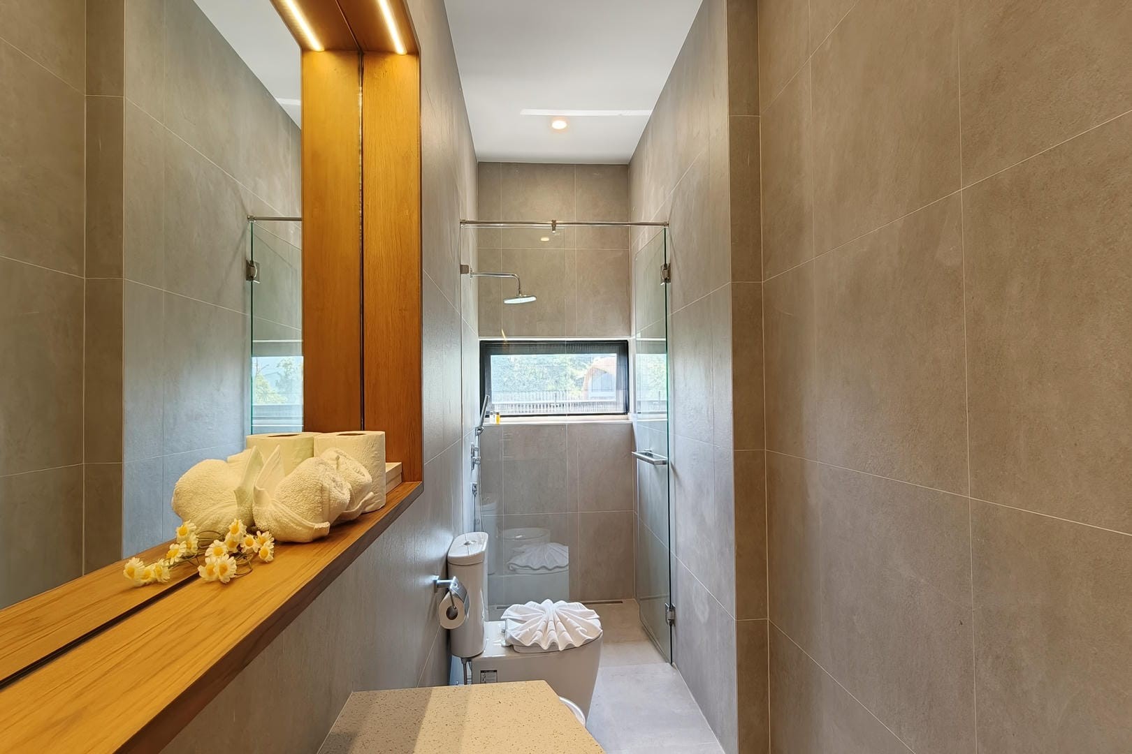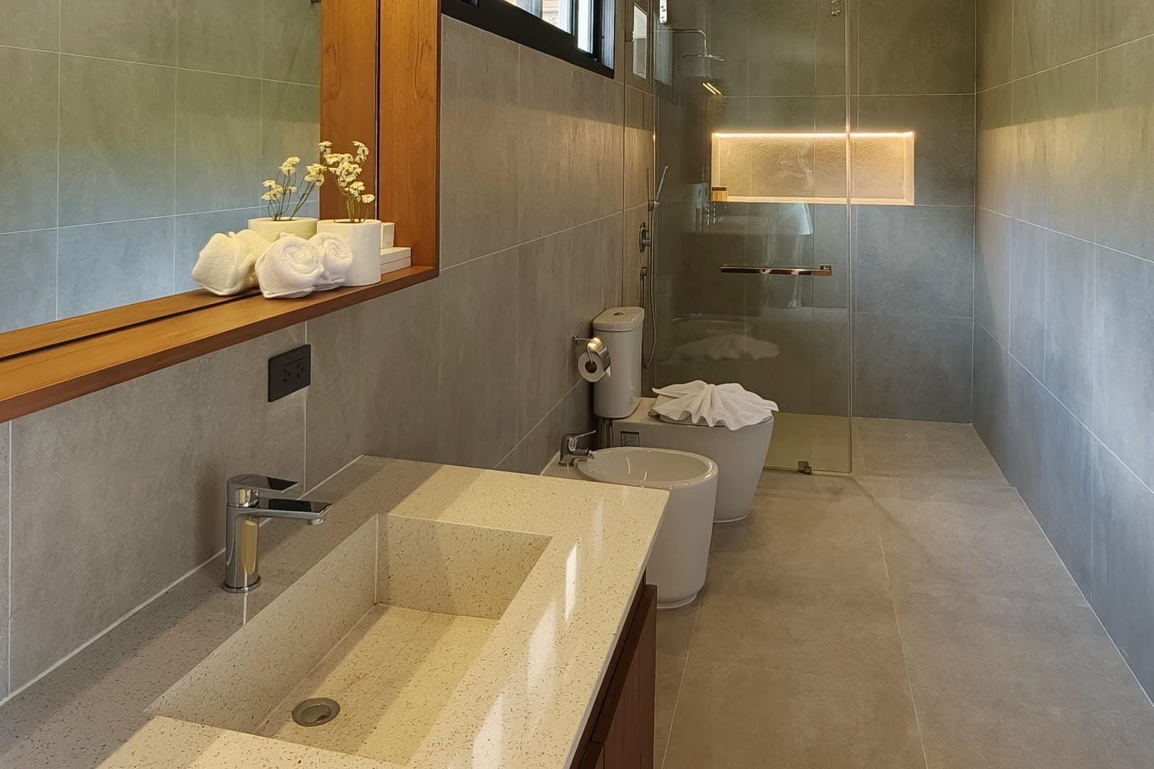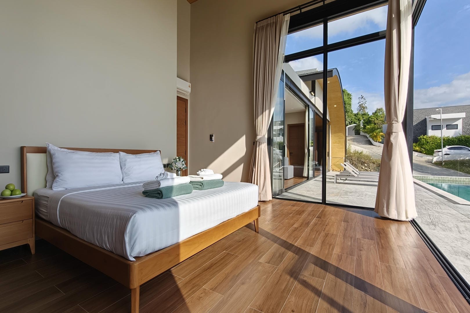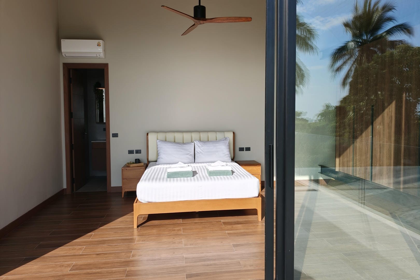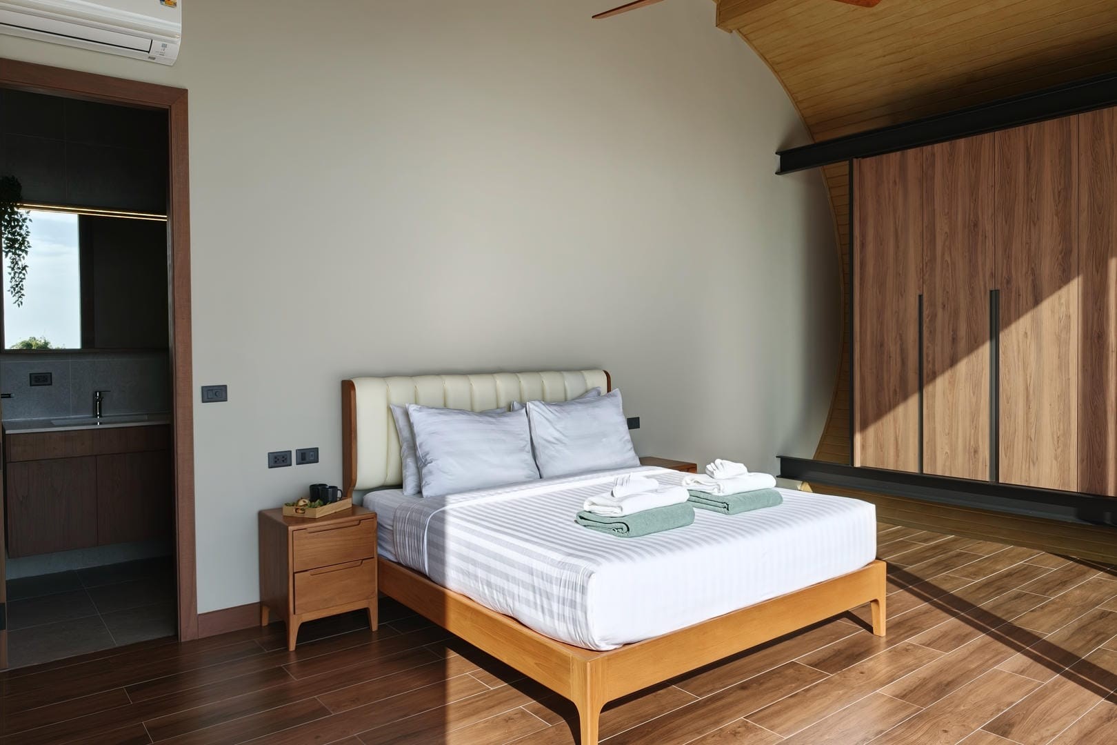 The villa offers three well-appointed bedrooms, each styled with clean lines, calming tones, and practical furnishings. Designed for comfort and privacy, the bedrooms provide a peaceful retreat after a day exploring the island. The layout makes the villa ideal for families, couples travelling together, or small groups seeking a private and tranquil environment.