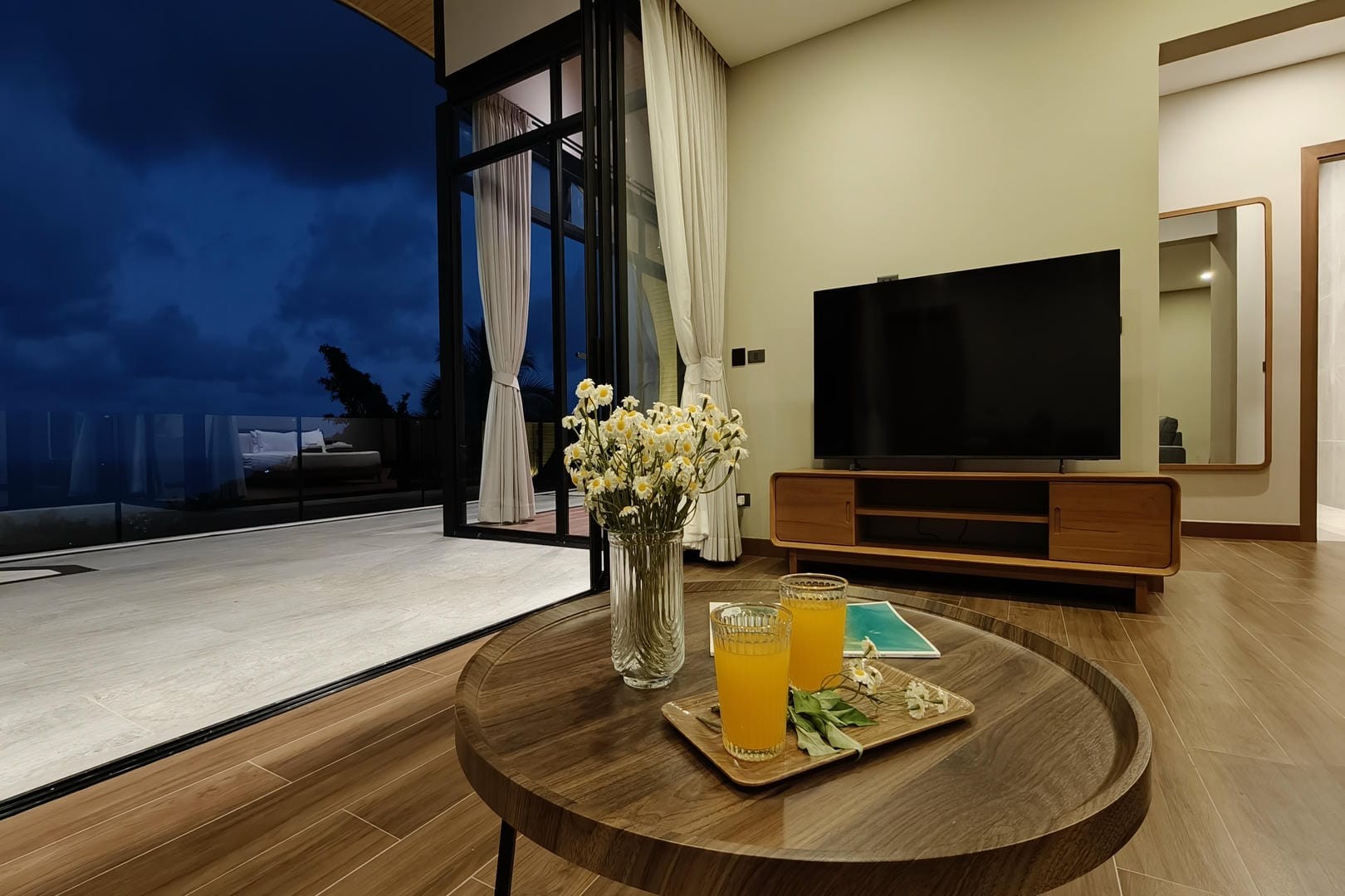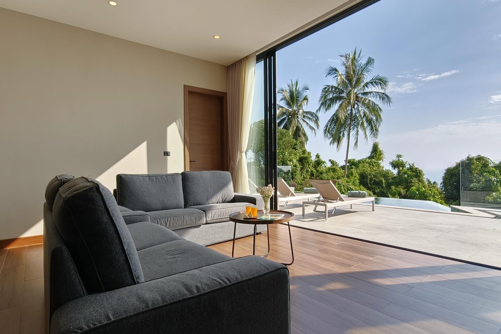 Inside, Villa Tenament features a bright and airy open-plan layout designed to maximise comfort and natural light. Floor-to-ceiling windows frame uninterrupted sea views and allow sunlight to pour into the living area throughout the day. The indoor space connects effortlessly to the outdoor terrace, creating a harmonious flow between interior and exterior living.